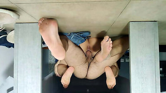 la serveuse reçoit une éjaculation interne dans sa chatte couleur crème sous la table