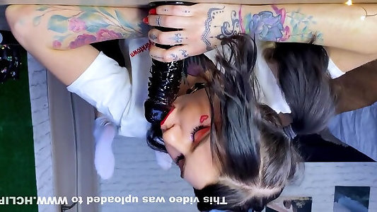 une adolescente en forme décole fait une pipe avec un gode bbc et du sperme crémeux dessus