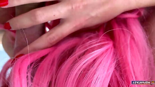 une nymphe aux cheveux roses saute sur une bite et je jouis en elle