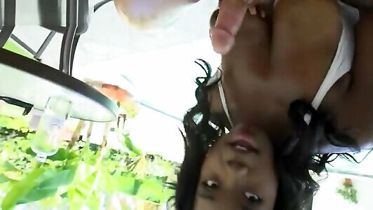 une ado potelée se masturbe puis commence à sucer une bite noire