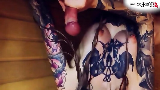 un cascadeur encré aux gros seins suce pendant une double invasion