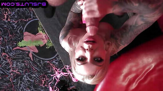 une fille pov tatouée suce profondément la bite de son petit ami tout en parlant sale