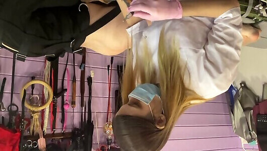 blondie doc aux grosses fesses et sa patiente aux cheveux noirs, branlette avec fucktoy