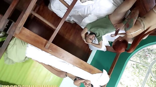 un étalon chanceux a de la joie avec 2 filles vénézuéliennes qui se relaient pour monter une sucette détrangers dans une auberge en europe