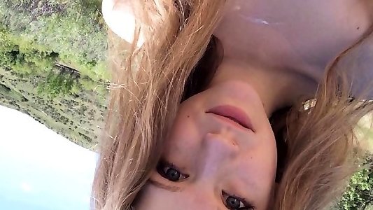 exhibitionniste publique & ndash; dame allemande avec de gros seins brillants sur la mer clignotant et tâtonnant des lèvres