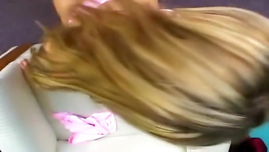 une blonde chaude enflammée avec un cadeau danniversaire fait une bonne pipe à son homme