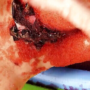 jolie sunny-belle ado rousse caressant sa chatte avec des fraises mûres