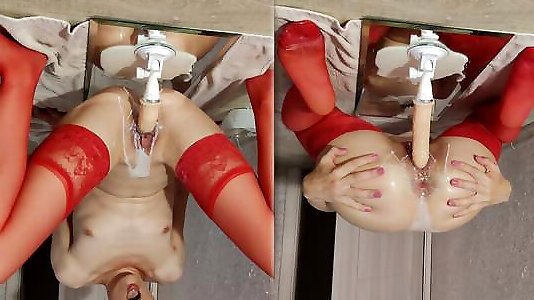 horny k1tty en bas rouges chevauche un vibromasseur dans du lait, suce et lèche le lait avec plaisir-fétichisme des pieds et du lait