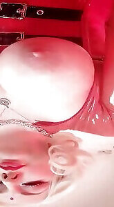 milf blonde arya grander en combinaison de latex rouge taquinant avec un gode-ceinture