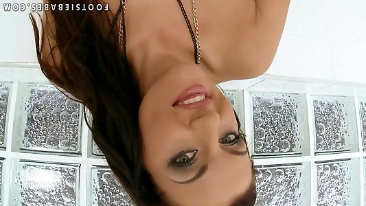 la call-girl aux cheveux noirs baisable donne du feetjob au gode attachable