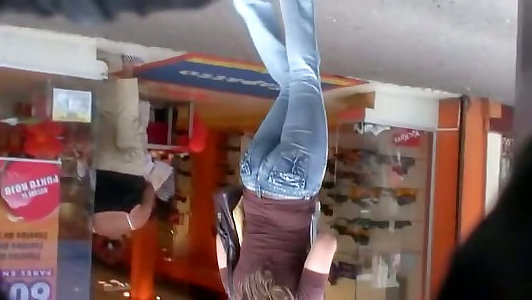 une nana en denim haut la main qui marche dans la rue avec une spycam derrière elle