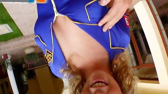 une éclaireuse blonde se fait asperger de sperme par une grosse bite