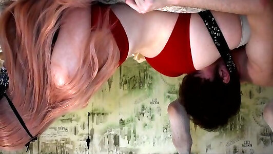 fille dominante maîtresse liée bondage mec au sous-sol, sucé et baisé sa bouche avec un gode, dominatrice, adolescents