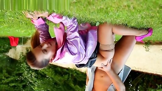 cougar en minijupe en cuir et talons hauts pisse en plein air gros plan