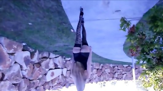 stacy, la blonde aux cendres, a baisé dans un tabouret vêtue de bas à la hanche et de chaussons à talons hauts