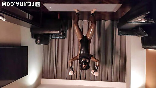 fejira com femme vêtue de latex attachée et suspendue pour être tâtonnée et fouettée