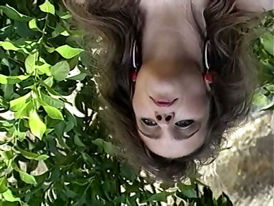 nymphe aux cheveux foncés dans la lingerie sexy uber éclaire ses seins sucrés et sucrés sur la webcam dans le jardin