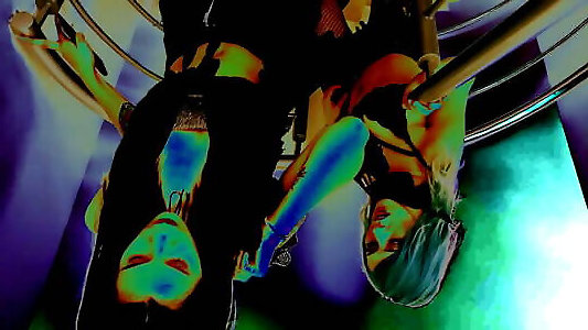 une asiatique et son amie baisent avec un gode à double extrémité et se masturbent avec des jouets dans les escaliers
