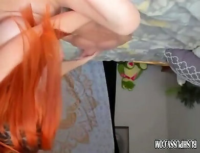 rousse brûlante avec des livres de brousse énorme faux pénis sur cam
