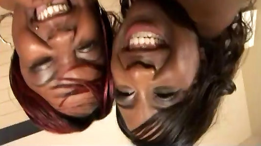 des lesbiennes ébène aux gros seins sembrassent avec de longs jouets en caoutchouc