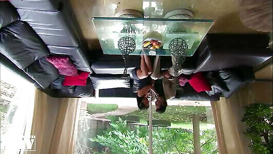 une ado sexy chevauche un énorme gode sur une table en verre et gémit bruyamment