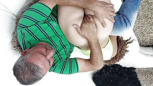 un homme mûr avec un ciseau charnu frappe une adolescente très menue en public