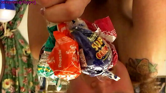 bbw babe joue de sa chatte avec une longue sucette sucrée