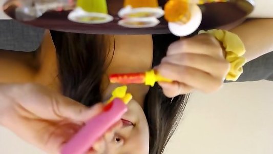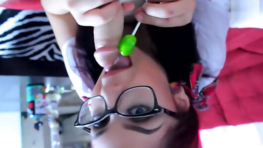 mignonne gorge profonde double chupa-chups et pincement amusez-vous! quand mon copain est au travail!