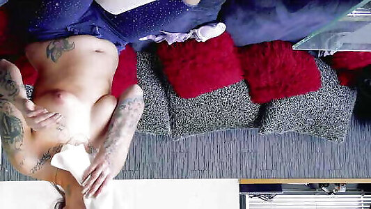 un adolescent cascadeur en queue de cheval et mini-jupe aime inhaler et baiser une bite dure sur le canapé