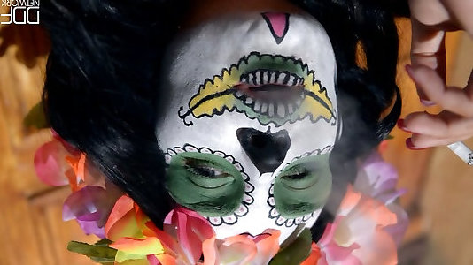 une nana aux seins énormes qui a des laits de maquillage zombie et son cookie rasé sur une caméra