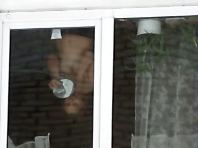 une dame aux seins nus et chauds se maquille par une fenêtre