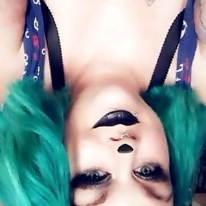 salope gothique aux gros seins avec du rouge à lèvres vert et du maquillage se fait éjaculer directement dans son estomac!