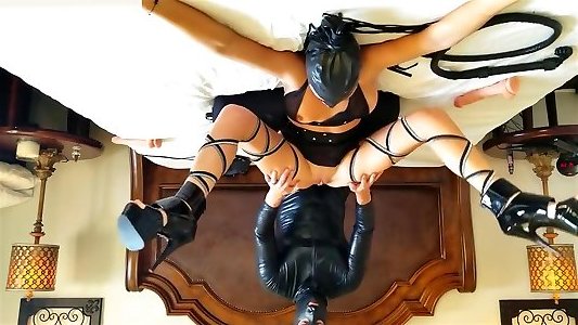 facesitting femdom avec cul en latex pour esclave laid masqué. culte du cul