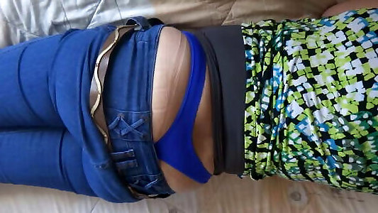 mature montre son cul charnu en jean, doigté, masturbation