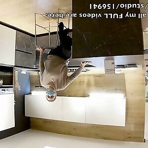 joyeuse lukerya dans la cuisine flirtant avec des fans tout en étant assise sur la machine à laver et se transformant en lingerie glamour