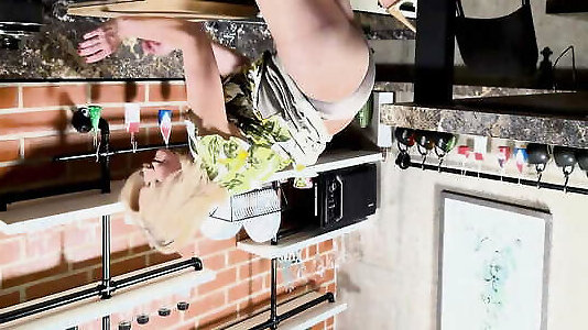 mamie boueuse avec des seins affaissés pose en collants dans la cuisine