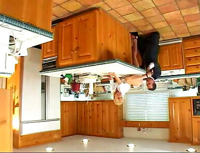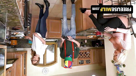 la milf blonde aux cendres lika enfile ses collants noirs et se moque dans la cuisine