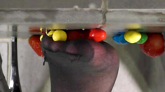 domme écrase la nourriture sucrée avec des talons hauts et des collants