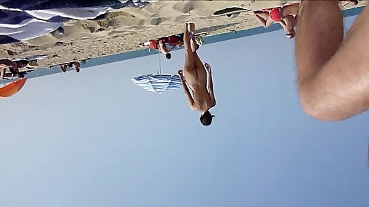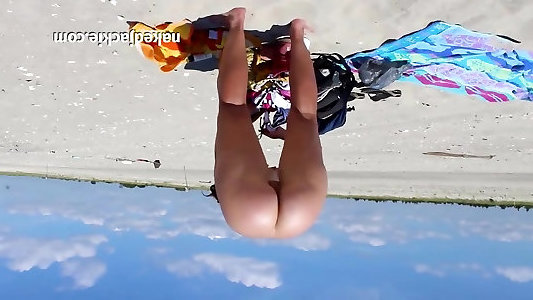 nu sur la plage, le cul et les nichons huilés, la chatte pète