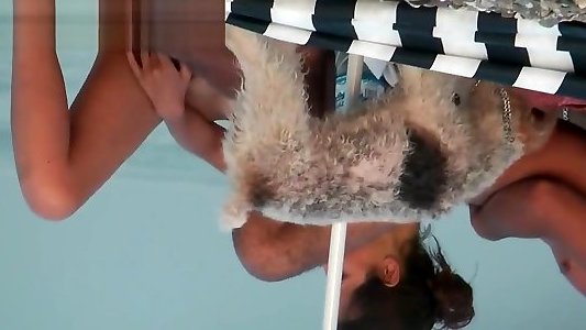 katy en bikini cramoisi avec une vulve hirsute sous leau