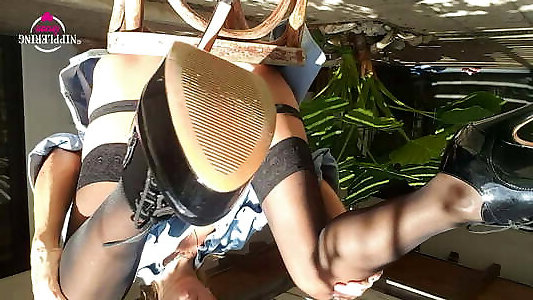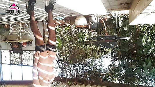 tétons amoureux milf coquine talons hauts bas lèvres de chatte percées éperonnage de lourdes chaînes mamelons percés gigantesques en plein air