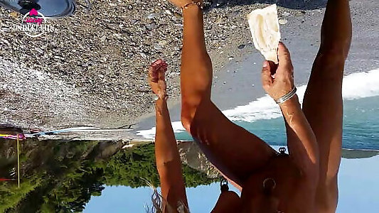 nippleringlover & ndash; milf ultra-pervers est sans soutien-gorge à la plage de nudistes, étirant la chatte percée grande ouverte montrant des mamelons percés épais et