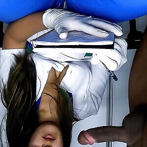 une infirmière époustouflante avec des seins énormes étudie la bite avec des mitaines
