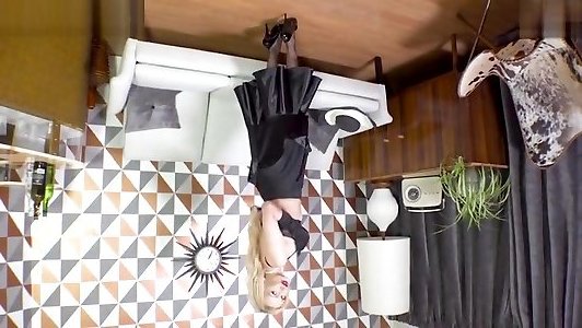 une méga-salope blonde avec des melons congénitaux porte des bas nylons et des pantoufles à talons hauts