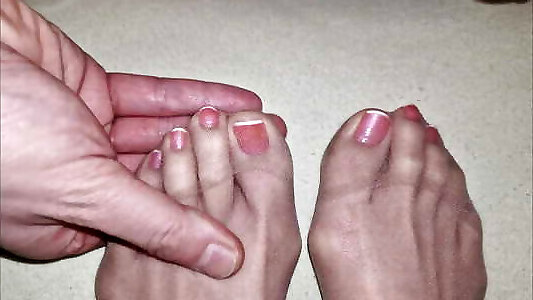 pov doucement massage des pieds en nylon de belles jambes de maîtresse