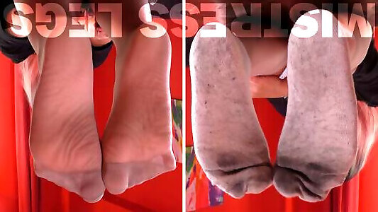 maîtresse taquine les pieds dans des chaussettes blanches sales sur des collants