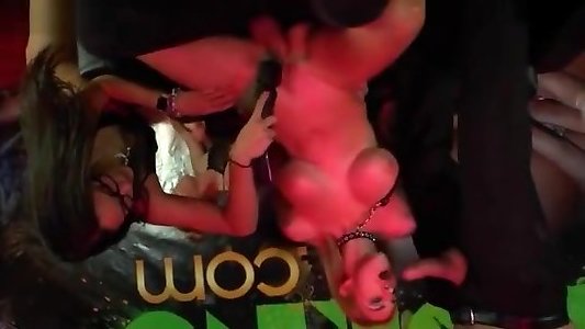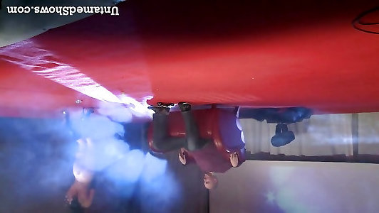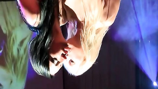 couguar aux cheveux foncés et promiscueux avec des poitrines molles avec des fesses rigides sur scène
