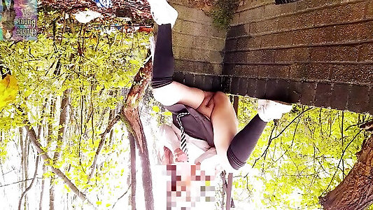 merveilleux japonais en collants avec uniforme se fait doigter en plein air en réalité