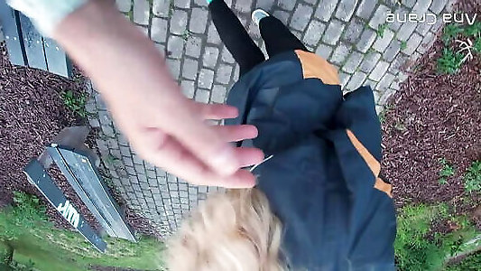 une méga-salope aux cheveux clairs et époustouflante suce une bite dans le parc