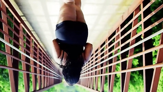 brune aux yeux - exhibitionniste marche nue sur le pont n
